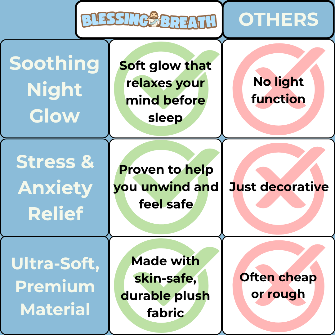 Because BlessingBreath™ isn’t just a plush — it’s designed to calm your mind, ease your stress, and help you sleep better. Here’s how it stands out from ordinary plush toys.